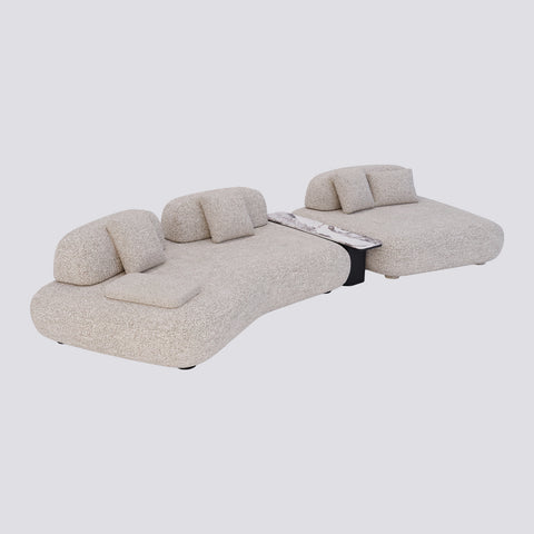 Bu modelde, iki modül arasında yer alan özel tasarım mermer sehpa yapısal olarak koltukla bir arada sunulur.