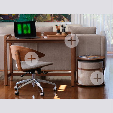 Bu Üç Parçalı Mobilya Takımı, modern ve davetkar bir çalışma alanı sunan dinamik ve yerden tasarruf sağlayan bir çözümdür. Çalışma Masası, Ofis Koltuğu ve Gizli Puflu Puf kombinasyonu, hem iş hem de boş zaman ihtiyaçlarınıza cevap veren uyumlu ve işlevsel bir ortam yaratır.